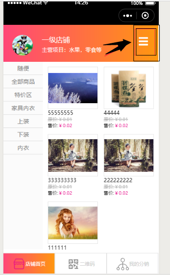 3.若需要返回到此小程序的任意页面时,点击分销店铺的导航栏即可,如图所示:
